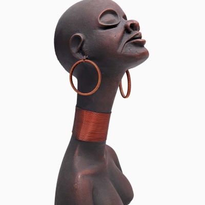 ‘Happy Thoughts,’ is a striking sculptural bust that captures the pure essence of inner peace and quiet joy. This elegant piece features a stylized figure with an elongated neck, graceful posture, and a serene, upturned face. With eyes gently closed in quiet reflection, the sculpture perfectly embodies the tranquil retreat into one's own mind. Crafted with a rich, dark patina that evokes the warmth of aged bronze or earth, the artwork is beautifully contrasted by intricate, copper-toned wire wrapping that forms a striking choker and bold hoop earrings. This captivating artwork draws the eye and invites moments of calm, mindfulness, and reflection into any environment.